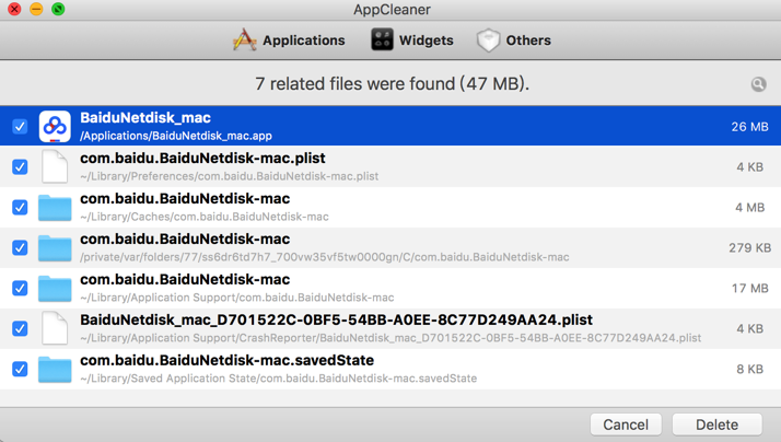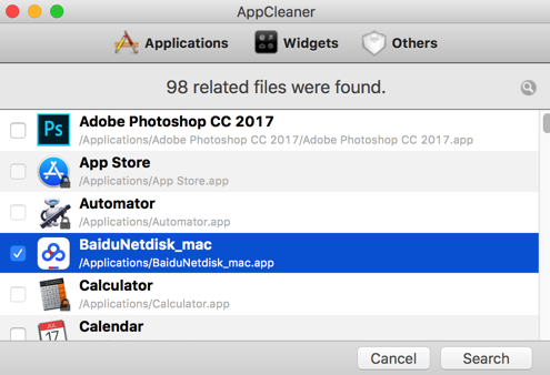 AppCleaner -》Applications-》勾选你要删除的软件,比如此处的 百度网盘 -》Search-》(默认已经)勾选(搜索出的)要删除的该软件相关的内容-》Delete