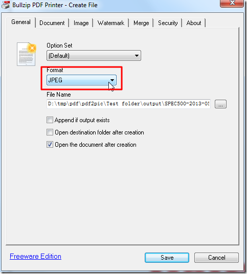 然后会跳出Bullzip的对话框,此时,把输出格式改为JPEG: