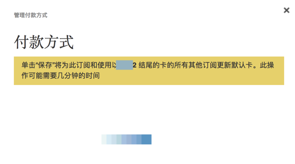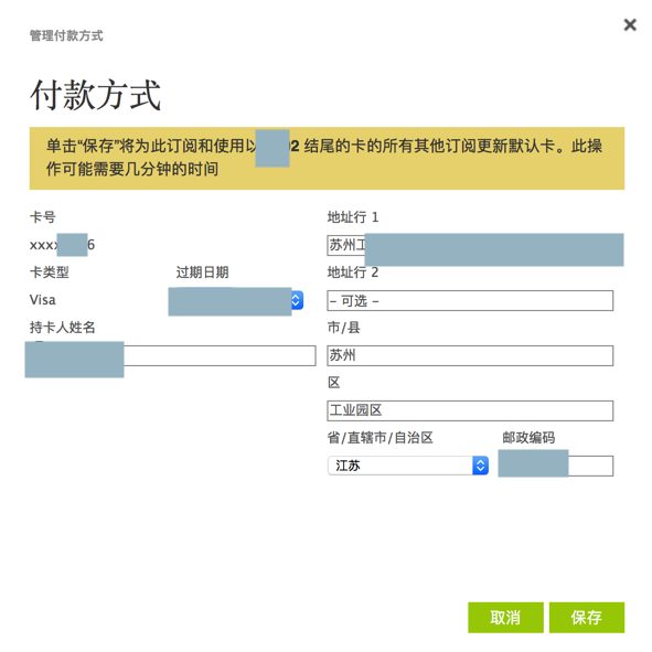 单击“保存”将为此订阅和使用以 xxx2 结尾的卡的所有其他订阅更新默认卡。此操作可能需要几分钟的时间