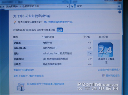 BF给我装了一个Vista来试用,说比较新潮一点,我也可以顺便感受一下Vista是怎么样的。装好系统之后,BF说先看看性能得分,于是就拍了下面这张图。