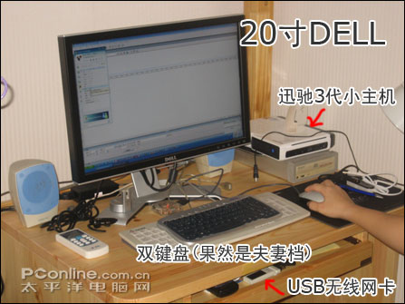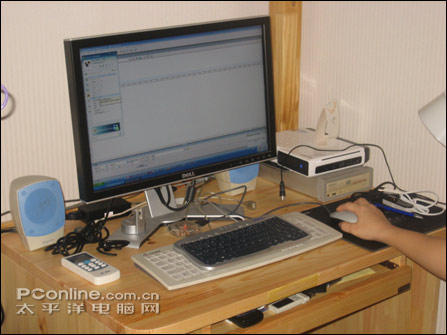 说一下总体印象吧,这种黑色的本本就肯定不是我喜欢的类型了,感觉有点大而且对女孩子来讲还挺重,我用放在桌面上当台式机用就差不多,不过对BF来说就没问题了,呵呵。不过我BF也有这种节省空间的小主机,再接一个大屏幕LCD,其实也挺好用