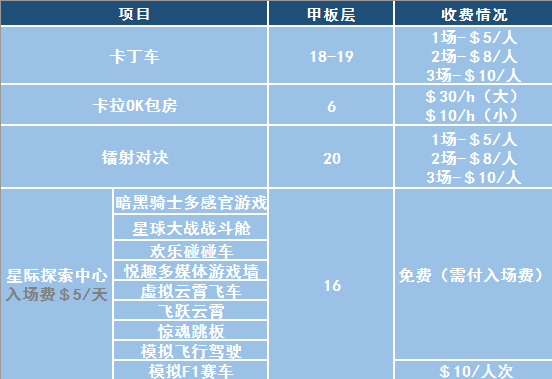 2.上船第一件事情,先到6楼或者打电话预约卡丁车和收费餐厅啊!千万别觉得这是收费的,不会有多少人去。