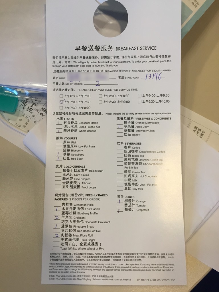 当你早上想好好睡个懒觉,不想早起去各个餐厅吃饭,或者要早起有事情(比如第二天早起去上岸日本长崎),则可以: