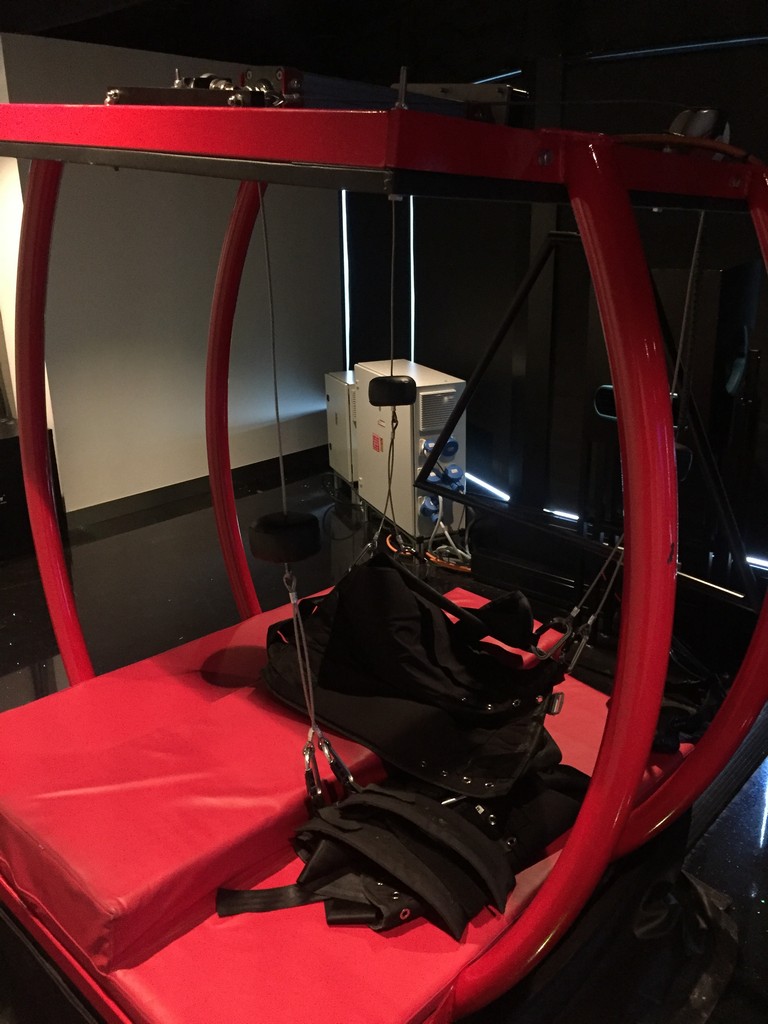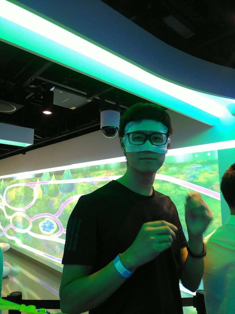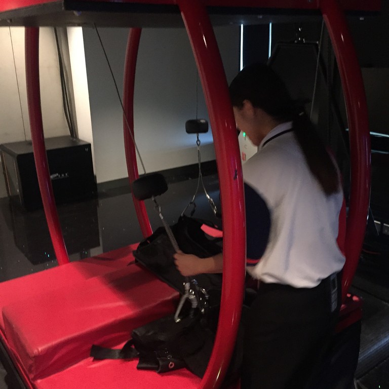 • 飞跃云霄Cloud Glider:进去后“五花大绑”,戴上VR头盔,身上和腿上挂上带子悬空,手臂握着横杆,在虚拟世界里驾驶滑翔伞去滑翔,总体体验还凑合。但是对于带近视镜的我,有点麻烦。而且出来有有点点晕。总体体验一般。排队很慢,一次1个人,平均一个人要等近15分钟。
