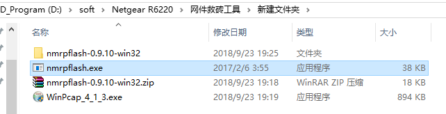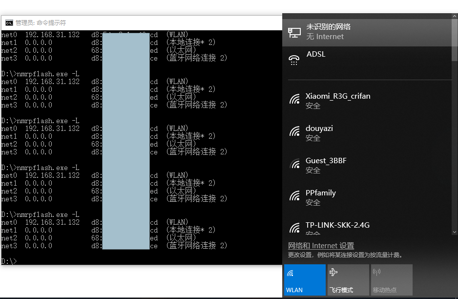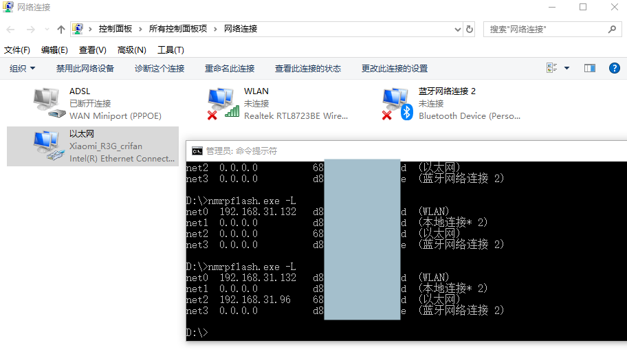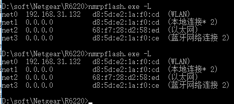 <code>D:\soft\Netgear\R6220>cd ../.. D:\soft>cd .. D:\>nmrpflash.exe -L net0 192.168.31.132 d8:x.x.x.:cd (WLAN) net1 0.0.0.0 d8:x.x.x:cd (本地连接* 2) net2 0.0.0.0 68:x.x.x:ed (以太网) net3 0.0.0.0 d8:x.x.x:ce (蓝牙网络连接 2) </code>