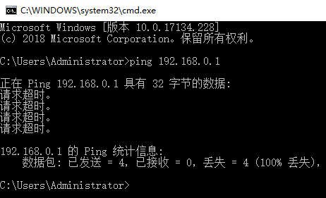 <code>C:\Users\Administrator>ping 192.168.0.1 正在 Ping 192.168.0.1 具有 32 字节的数据: 请求超时。 请求超时。 请求超时。 请求超时。 192.168.0.1 的 Ping 统计信息: 数据包: 已发送 = 4,已接收 = 0,丢失 = 4 (100% 丢失), C:\Users\Administrator> </code>
