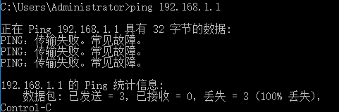 <code>C:\Users\Administrator>ping 192.168.1.1 正在 Ping 192.168.1.1 具有 32 字节的数据: PING:传输失败。常见故障。 PING:传输失败。常见故障。 PING:传输失败。常见故障。 192.168.1.1 的 Ping 统计信息: 数据包: 已发送 = 3,已接收 = 0,丢失 = 3 (100% 丢失), Control-C ^C </code>