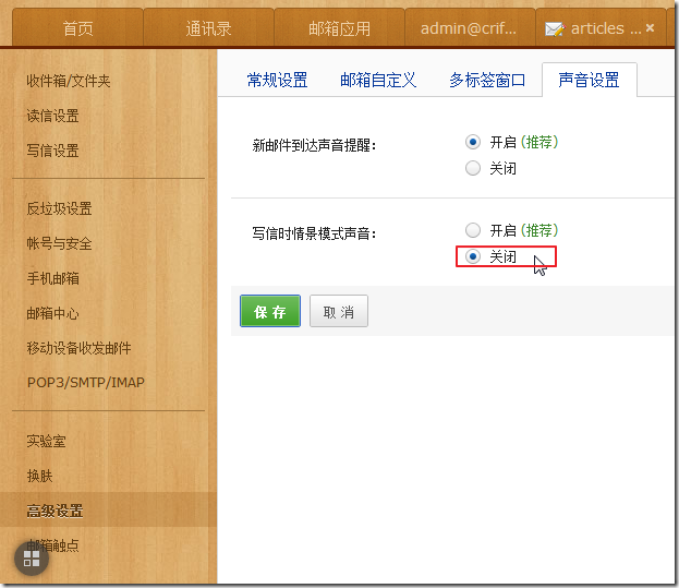 高级设置->声音设置->写信时情景模式声音->默认是:开启: