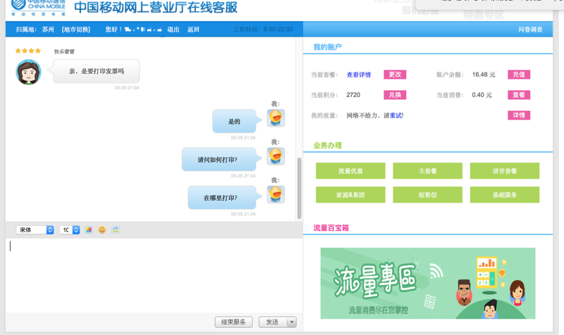 快乐蕾蕾 您好,很高兴为您服务! 05-05 21:03 快乐蕾蕾 亲,是要打印发票吗 05-05 21:04 我: 是的 05-05 21:04 我: 请问如何打印? 05-05 21:04 我: 在哪里打印? 05-05 21:04 快乐蕾蕾 亲,苏州公司优先使用139邮箱推送,后自行打印哦 05-05 21:05 我: 但是邮箱中的打印出来 有盖章吗? 可以用于正规的公司报销吗? 05-05 21:06 快乐蕾蕾 亲,可以报销的哦 05-05 21:06 我: “苏州公司优先使用139邮箱推送”,具体如何操作? 去哪里登录139邮箱? 进入后如何操作? 05-05 21:07 快乐蕾蕾 亲,去营业厅哦 05-05 21:08 我: 在线不能办理吗? 必须去营业厅? 那你刚才说的139邮箱 又是怎么回事,不是在线操作就可以的吗? 05-05 21:09 快乐蕾蕾 亲,去营业厅,营业厅把打印的发票推送到您的邮箱,后自已打印哦 |