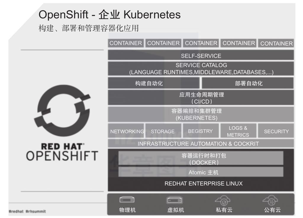 - OpenShift是由RedHat推出的企业级Kubernetes平台,其主要目标是构建以OCI(Open Container Initiative)容器封装和Kubernetes容器集群管理为核心,对应用生命周期进行管理并实现DevOps工具链等完整功能的开源容器PaaS平台。
