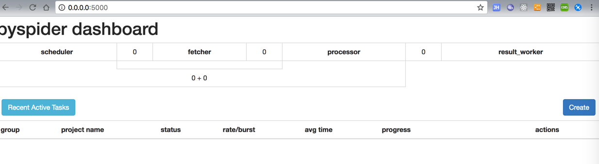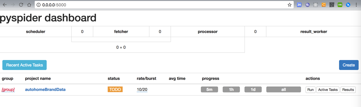 <code>➜ AutocarData pyspider -c config.json all phantomjs fetcher running on port 25555 AutohomeResultWorker init resultdb=<pyspider.database.mysql.resultdb.ResultDB object at 0x1025b3c18>, inqueue=<pyspider.libs.multiprocessing_queue.MultiProcessingQueue object at 0x1025b3a20> connect mysql ok, self.connection= <pymysql.connections.Connection object at 0x102763d30> Connect mysql return True self.mysqldb=<AutohomeResultWorker.MysqlDb object at 0x102763cc0> [I 180508 21:13:12 result_worker:49] result_worker starting... [I 180508 21:13:12 tornado_fetcher:638] fetcher starting... [I 180508 21:13:12 processor:211] processor starting... [I 180508 21:13:12 scheduler:647] scheduler starting... [I 180508 21:13:12 scheduler:126] project autohomeBrandData updated, status:TODO, paused:False, 0 tasks [I 180508 21:13:12 scheduler:782] scheduler.xmlrpc listening on 127.0.0.1:23333 [I 180508 21:13:12 scheduler:586] in 5m: new:0,success:0,retry:0,failed:0 [I 180508 21:13:12 app:76] webui running on 0.0.0.0:5000 </code>