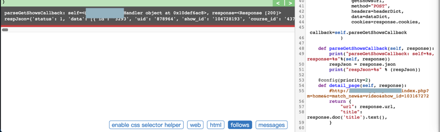 <code>parseGetShowsCallback: self=<x.x.x.Handler object at 0x10def6ac8>, response=<Response [200]>