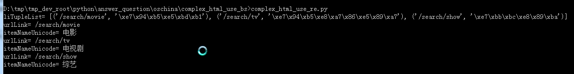 #!/usr/bin/python # -*- coding: utf-8 -*- """ Function: 【问题解答】建议:处理html时复杂的需求,建议使用专门的库比如BeautifulSoup去处理而不要用正则【问题解答】建议:处理html时复杂的需求,建议使用专门的库比如BeautifulSoup去处理而不要用正则Author: Crifan Li Version: 2013-10-17 Contact: https://www.crifan.com/about/me/ """ import re def complex_html_use_re(): """"demo how to use re to process complex html""" complexHtml = """<div class="lib-cat"><h3>分类索引</h3><div class="list"><ul><li><a href="/search/movie">电影</a></li><li><a href="/search/tv">电视剧</a></li><li><a href="/search/show">综艺</a></li></ul></div></div>"""; liTupleList = re.findall('<li><a href="([^"]+?)">([^<>]+?)</a></li>', complexHtml) print "liTupleList=",liTupleList for eachTuple in liTupleList: urlLink, itemNameUtf8 = eachTuple print "urlLink=",urlLink itemNameUnicode = itemNameUtf8.decode("utf-8") print "itemNameUnicode=",itemNameUnicode #Final Output: # urlLink= /search/movie # itemNameUnicode= 电影 # urlLink= /search/tv # itemNameUnicode= 电视剧 # urlLink= /search/show # itemNameUnicode= 综艺 if __name__ == "__main__": complex_html_use_re();