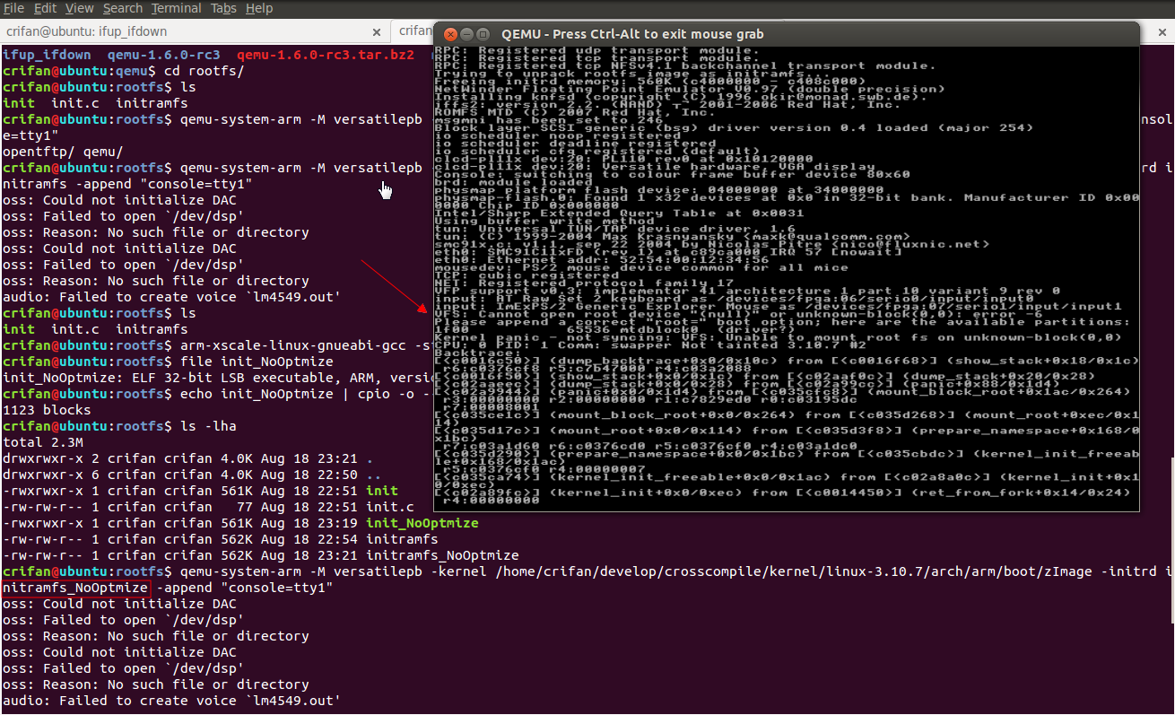 crifan@ubuntu:rootfs$ ls -lha total 2.3M drwxrwxr-x 2 crifan crifan 4.0K Aug 18 23:21 . drwxrwxr-x 6 crifan crifan 4.0K Aug 18 22:50 .. -rwxrwxr-x 1 crifan crifan 561K Aug 18 22:51 init -rw-rw-r-- 1 crifan crifan 77 Aug 18 22:51 init.c -rwxrwxr-x 1 crifan crifan 561K Aug 18 23:19 init_NoOptmize -rw-rw-r-- 1 crifan crifan 562K Aug 18 22:54 initramfs -rw-rw-r-- 1 crifan crifan 562K Aug 18 23:21 initramfs_NoOptmize crifan@ubuntu:rootfs$ qemu-system-arm -M versatilepb -kernel /home/crifan/develop/crosscompile/kernel/linux-3.10.7/arch/arm/boot/zImage -initrd initramfs -append "console=tty1"