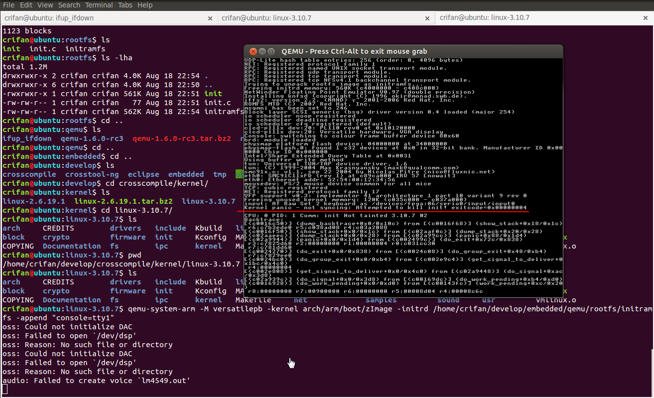 crifan@ubuntu:linux-3.10.7$ pwd /home/crifan/develop/crosscompile/kernel/linux-3.10.7 crifan@ubuntu:linux-3.10.7$ ls arch CREDITS drivers include Kbuild lib mm README scripts System.map virt block crypto firmware init Kconfig MAINTAINERS Module.symvers REPORTING-BUGS security tools vmlinux COPYING Documentation fs ipc kernel Makefile net samples sound usr vmlinux.o crifan@ubuntu:linux-3.10.7$ qemu-system-arm -M versatilepb -kernel arch/arm/boot/zImage -initrd /home/crifan/develop/embedded/qemu/rootfs/initramfs -append "console=tty1" oss: Could not initialize DAC oss: Failed to open `/dev/dsp' oss: Reason: No such file or directory oss: Could not initialize DAC oss: Failed to open `/dev/dsp' oss: Reason: No such file or directory audio: Failed to create voice `lm4549.out'