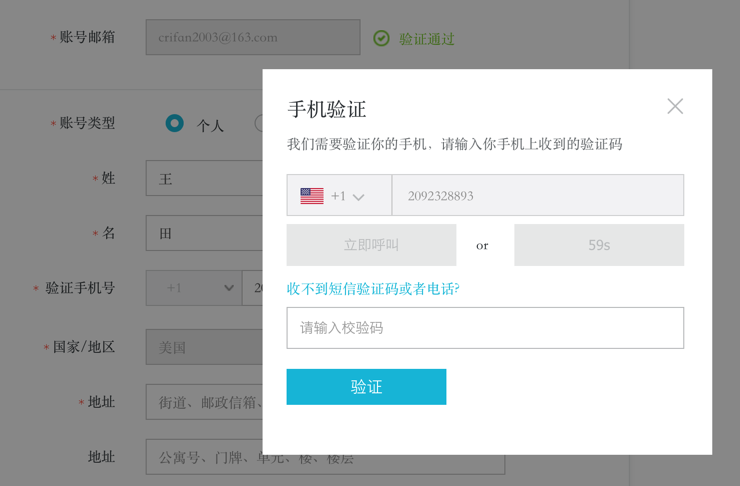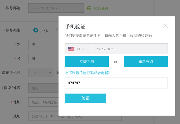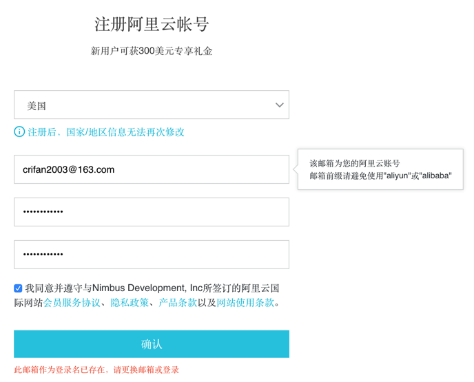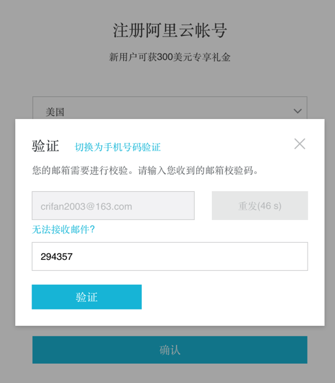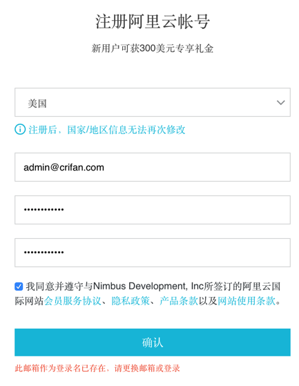 之后,重新去注册一个阿里云账号,记得选择地址是美国。