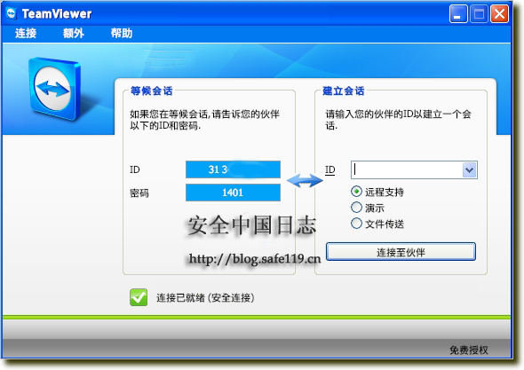 要进行远程控制,首先两方电脑都必须执行TeamViewer。 运行TeamViewer 后,TeamViewer的服务器会自动分配一个ID和密码给你,ID是固定的,但密码是随机的,每次执行都会不同。左边是您的ID和密码(若是对方要主动连你,要将此告诉对方),在右边输入对方的ID (连续输入不用空格)就可以连到对方了。