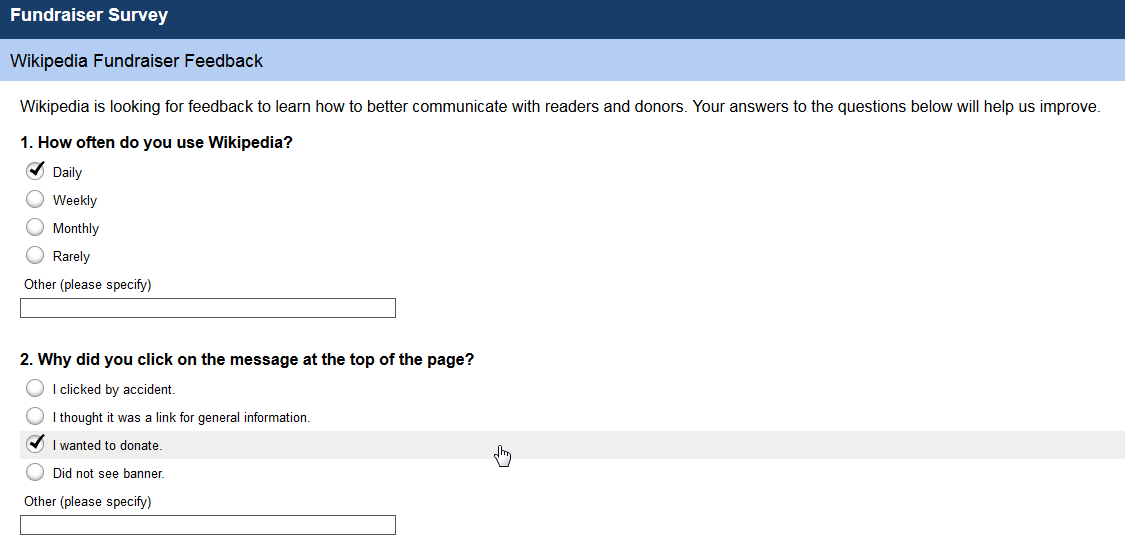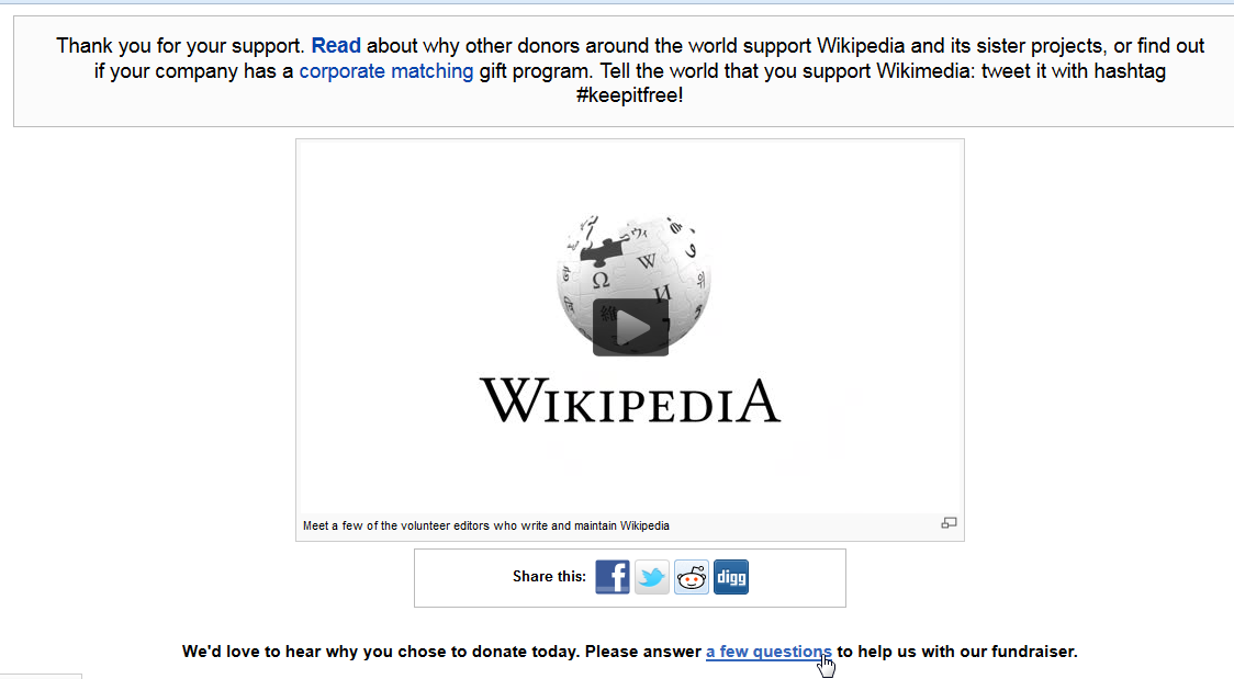 Dear …, Thank you for donating to the Wikimedia Foundation. You are wonderful! It’s easy to ignore our fundraising banners, and I’m really glad you didn’t. This is how Wikipedia pays its bills — people like you giving us money, so we can keep the site freely available for everyone around the world. People tell me they donate to Wikipedia because they find it useful, and they trust it because even though it’s not perfect, they know it’s written for them. Wikipedia isn’t meant to advance somebody’s PR agenda or push a particular ideology, or to persuade you to believe something that’s not true. We aim to tell the truth, and we can do that because of you. The fact that you fund the site keeps us independent and able to deliver what you need and want from Wikipedia. Exactly as it should be. You should know: your donation isn’t just covering your own costs. The average donor is paying for his or her own use of Wikipedia, plus the costs of hundreds of other people. Your donation keeps Wikipedia available for an ambitious kid in Bangalore who’s teaching herself computer programming. A middle-aged homemaker in Vienna who’s just been diagnosed with Parkinson’s disease. A novelist researching 1850s Britain. A 10-year-old in San Salvador who’s just discovered Carl Sagan. On behalf of those people, and the half-billion other readers of Wikipedia and its sister sites and projects, I thank you for joining us in our effort to make the sum of all human knowledge available for everyone. Your donation makes the world a better place. Thank you. Most people don’t know Wikipedia’s run by a non-profit. Please consider sharing this e-mail with a few of your friends to encourage them to donate too. And if you’re interested, you should try adding some new information to Wikipedia. If you see a typo or other small mistake, please fix it, and if you find something missing, please add it. There are resources here that can help you get started. Don’t worry about making a mistake: that’s normal when people first start editing and if it happens, other Wikipedians will be happy to fix it for you. I appreciate your trust in us, and I promise you we’ll use your money well. Thanks, Sue Gardner For your records: Your donation on 2013-07-02 08:14:14 was $16.00. This letter may serve as a record of your donation. No goods or services were provided, in whole or in part, for this contribution. The Wikimedia Foundation, Inc. is a non-profit charitable corporation with 501(c)(3) tax exempt status in the United States. Our address is 149 New Montgomery, 3rd Floor, San Francisco, CA, 94105. U.S. tax-exempt number: 20-0049703 You can follow us on Twitter, identi.ca or Google+, like us on Facebook and read our blog. Here is the Wikimedia Foundation annual report for 2010-11, the Wikimedia Foundation annual plan for 2012-13 and the Wikimedia Foundation’s five-year strategic plan. You can also now buy Wikipedia merchandise at shop.wikimedia.org. |