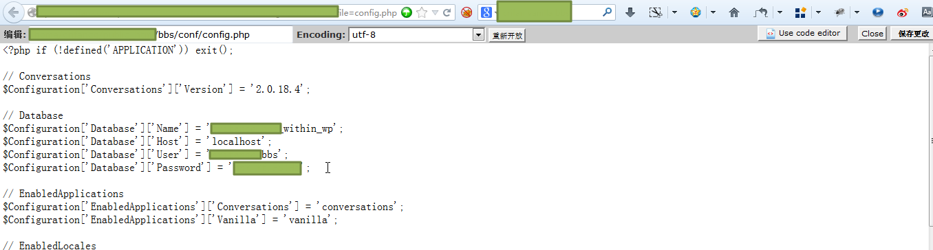 3.修改对应的vanilla的bbs下面的conf/config.php,更新其中的数据库,用户和密码,类似于: