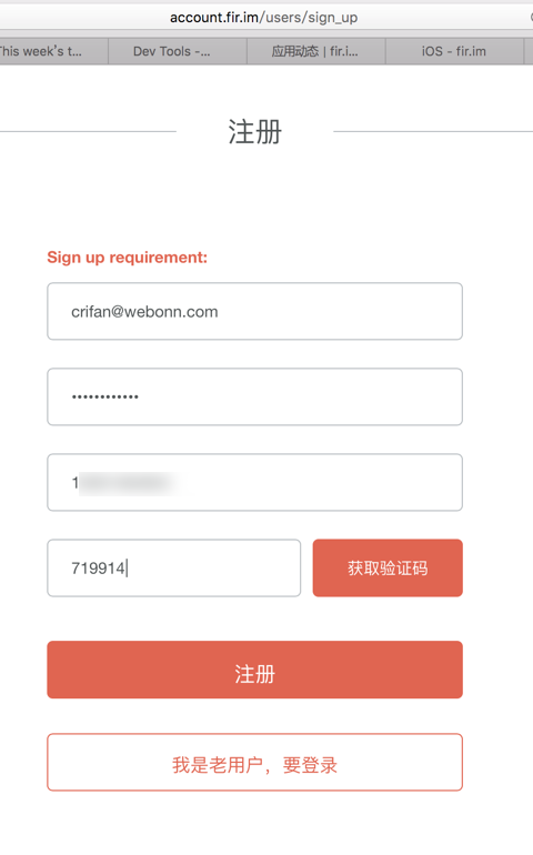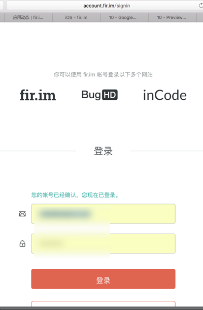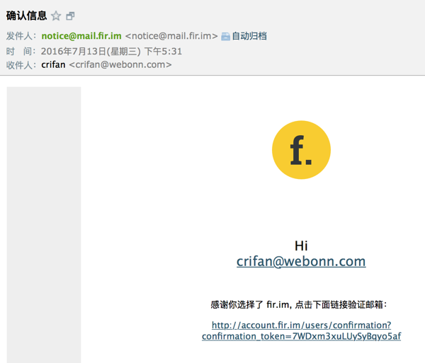 http://account.fir.im/users/sign_up去用:[email protected]去注册:说到确认邮件:之后即可登录。【后记】进去后,点击app管理,即可进入app页面:https://fir.im/apps转载请注明:在路上 » 【记录】注册app发布平台fir.im账号 Post Views: 1,315