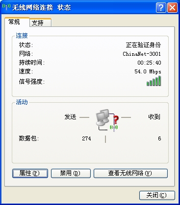 但是,此处我这里在验证身份那里就出了问题,无线网络的状态,一直显示“正在验证身份”,(注:正常应该是“已连接上”),而网络状态也是只有发送,没有接收,也就是,不能上网,如图:
