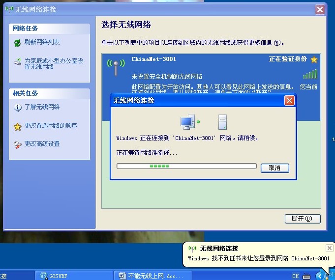 并且同时,右下角提示“Windows找不到证书来让您登陆到网络 ChinaNet-3001,如图: