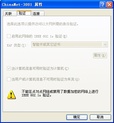 “启用此网络的IEEE802.1x验证”那里,是灰色的无法点击,并且下面有黄色警告信息,提示“不能在点对点网络或禁用了数据加密的网络上进行IEEE 802.1x 验证”。