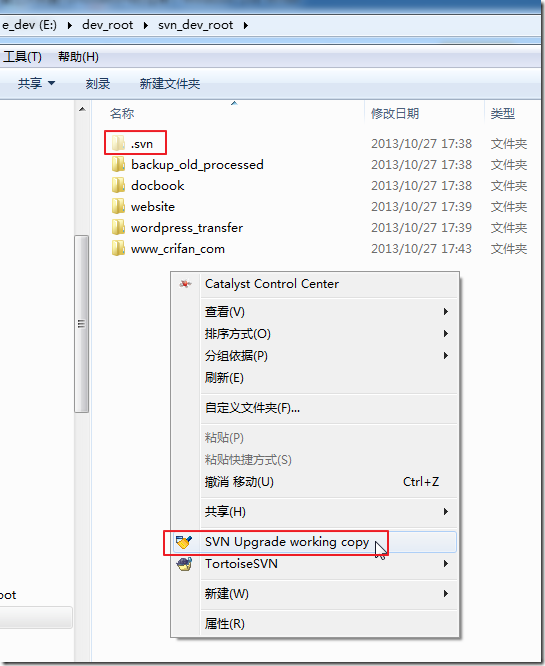 不过发现由于是最新安装的svn是新版的,所以需要先去更新working copy: