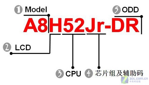 绝大多数华硕笔记本的型号都是由五部分组成,即“系列 屏幕 处理器 芯片组 – 光驱”。以华硕“A8H54Sr-SL”为例,开头的“A8”是一个系列的名称,后面的“H”代表14.1英寸液晶屏,“54”代表酷睿2双核T5450处理器,“Sr”代表PM965芯片组和HD 2400独立显卡,最后的“SL”则代表DVD刻录机。这种命名方式虽然较为复杂,但却保证了每个型号只会对应一种模具和配置的产品。