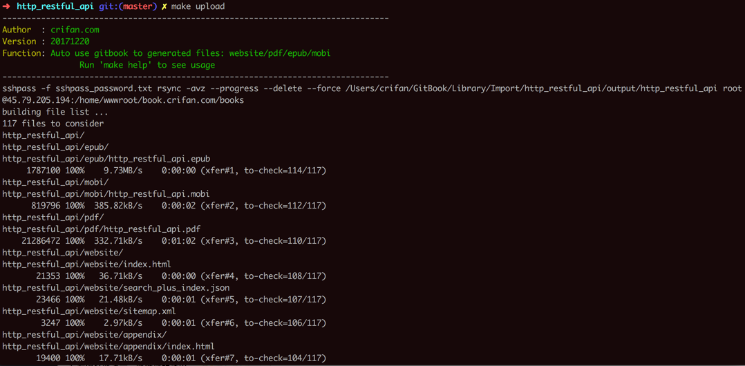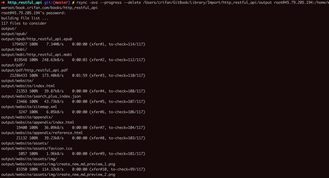 ➜ http_restful_api git:(master) ✗ rsync -avz –progress –delete /Users/crifan/GitBook/Library/Import/http_restful_api/output [email protected]:/home/wwwroot/book.crifan.com/books/http_restful_api