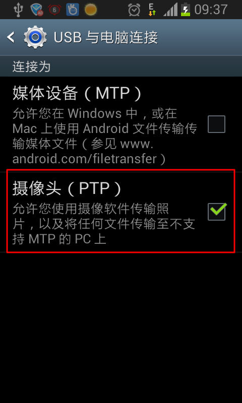 摄像头(PTP) 允许你使用摄像头软件传输照片,以及将任何文件传输至不支持MTP的PC上 |