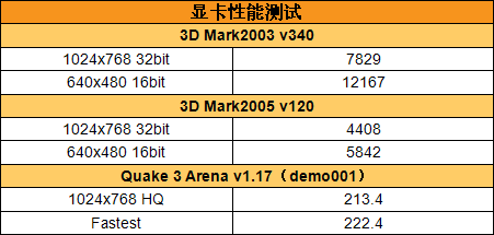 3DMark03和3DMark05均针对笔记本电脑在D3D方面的性能表现测试,我们运行其中的GameTest,记录系统在1024*768*32Bit时与640*480*16Bit时的测试成绩。