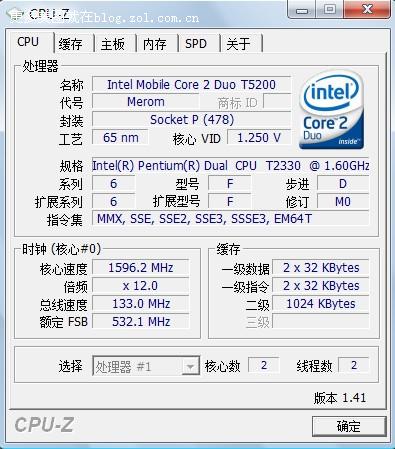 | 处理器数目 | 1 | | 核心数 | 2 每个处理器 | | 线程数 | 2 (最大 2) 每个处理器 | | 名称 | Intel Mobile Core 2 Duo T5200 | | 代号 | Merom | | 规格 | Intel(R) Pentium(R) Dual CPU T2330 @ 1.60GHz | | 封装 | Socket P (478) | | 系列/型号/步进 | 6.F.D | | 扩展系列/型号 | 6.F | | 核心步进 | M0 | | 工艺 | 65 nm | | 核心速度 | 1596.1 MHz | | 倍频 x 总线速度 | 12.0 x 133.0 MHz | | 额定总线速度 | 532.0 MHz | | 主频 | 1600 MHz | | 指令集 | MMX, SSE, SSE2, SSE3, SSSE3, EM64T | | L1 数据缓存 (每个处理器) | 2 x 32 KBytes,8-路设置关联,64-字节行大小 | | L1 指令缓存 (每个处理器) | 2 x 32 KBytes,8-路设置关联,64-字节行大小 | | L2 缓存 (每个处理器) | 1024 KBytes,4-路设置关联,64-字节行大小 |
