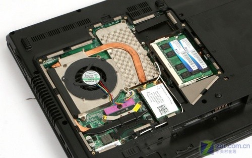 但在这款迅驰2笔记本中,我们看到P8600处理器的上面仅有一根热管,并没有覆盖其它散热片;相反,GM45北桥部分却额外占用了另一根纯铜导热管,同时还覆盖了大面积的散热片。