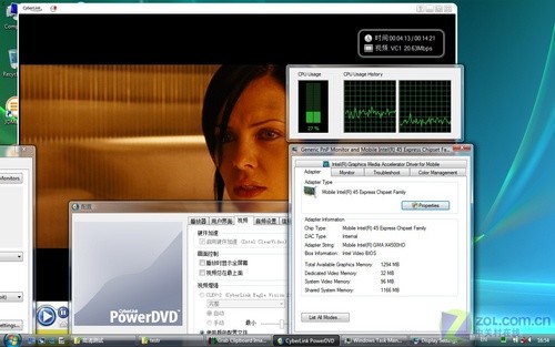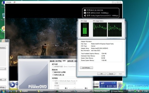 我们的测试方法是,利用PowerDVD这款视频播放软件,分别在开启和关闭ClearVideo视频技术的情况下,两次播放同一部高清电影,同时记录在播放过程中的平均CPU占用率,最后对比测试结果即可了解显卡视频加速技术的实际效用。