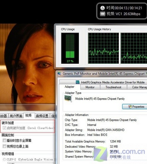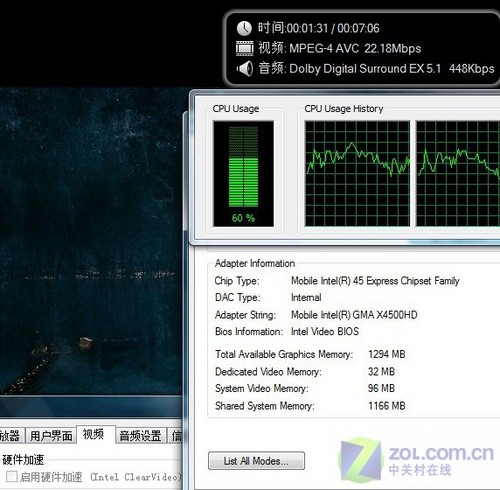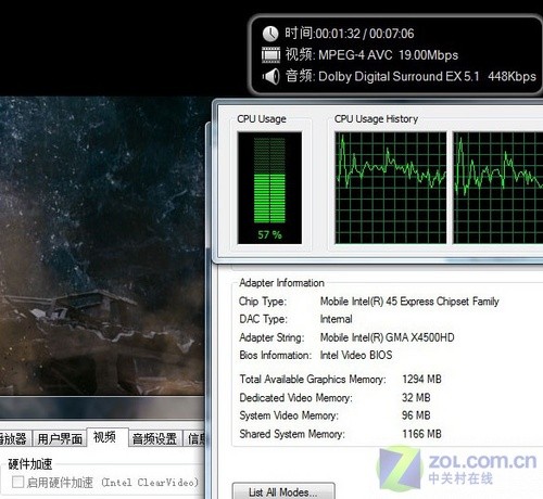测试结果令人稍感失望,迅驰2平台的集成显卡并没有提供对H.264编码的视频加速支持,无论我们开启还是关闭ClearVideo技术,在播放时该选项都为灰色的未启用状态。