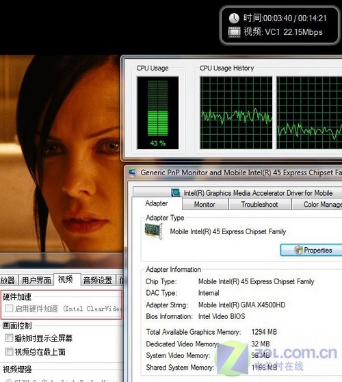 现在解码难度最大的高清电影大多都为H.264编码格式,而且它们正在逐渐成为主流,因此我们看到无论是NVIDIA还是AMD,都在一年前就为旗下的几乎所有独立显卡加入了H.264完全硬解码功能,能够将播放此类电影时的CPU占用率从90%以上降至10%以下。那么,这款GMA X4500集成显卡是否具有类似功能呢?