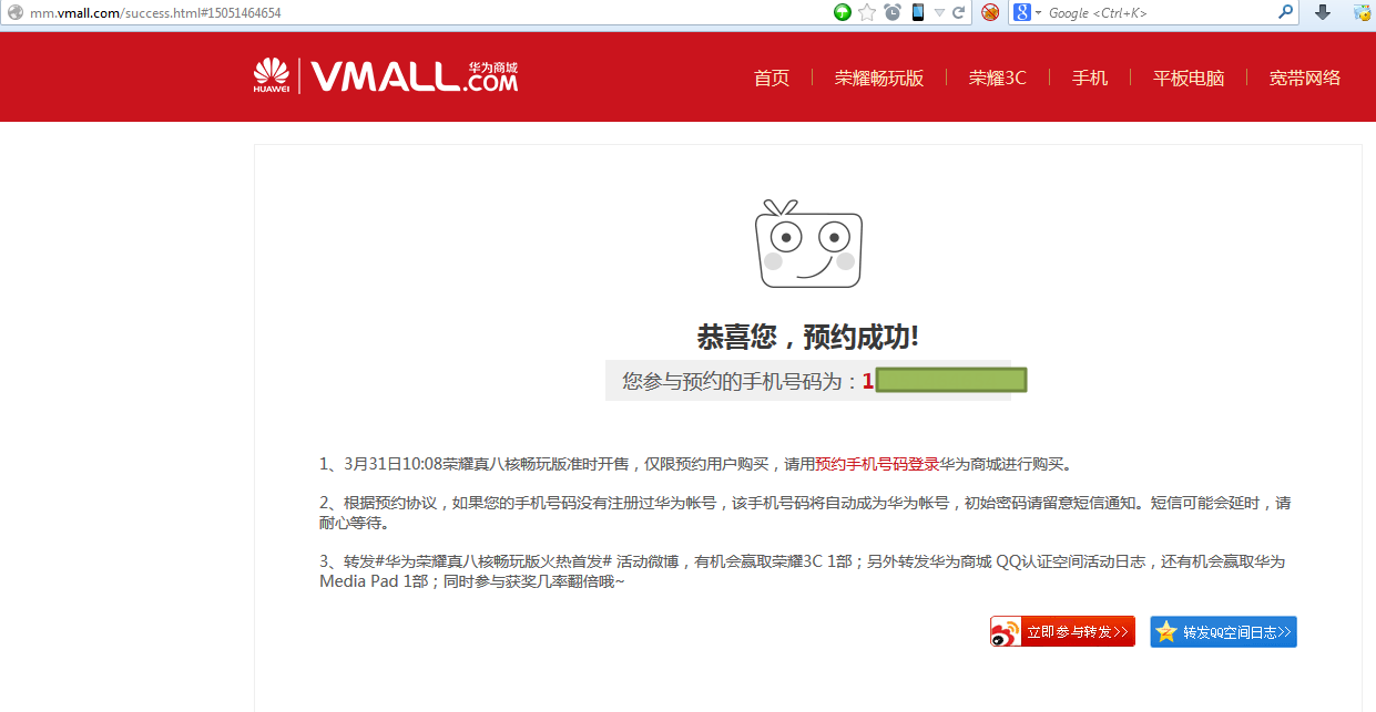 转载请注明:在路上 » 【记录】预约华为荣耀畅玩版并在2014-03-31那天去抢购