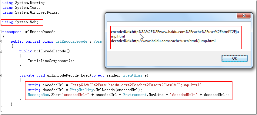 MessageBox.Show("encodedUrl=" + encodedUrl + Environment.NewLine + "decodedUrl=" + decodedUrl);