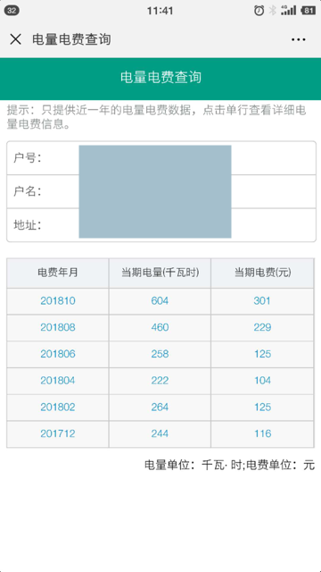 • 我的-》电费账单:查看最近6个月的每个月的用电量和已缴的电费。