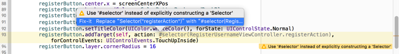 registerButton.addTarget(self, action: #selector(RegisterUsernameViewController.registerAction), forControlEvents: UIControlEvents.TouchUpInside)