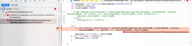 /Users/crifan/dev/dev_root/daryun/JianDao/iOS-Client/JianDao/TCBlobDownloadManager.swift:187:145: Nil is not compatible with expected argument type ‘NSFileManagerItemReplacementOptions’