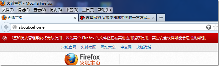 【问题】 打开Firefox时,提示自动更新,所以就去自动更新了,结果中途出问题,就终止了。 重新打开Firefox后,显示出错: 书签和历史管理系统将无法使用,因为某个Firefox的文件正在被其他应用程序使用。某些安全软件可能会造成此问题。 以...