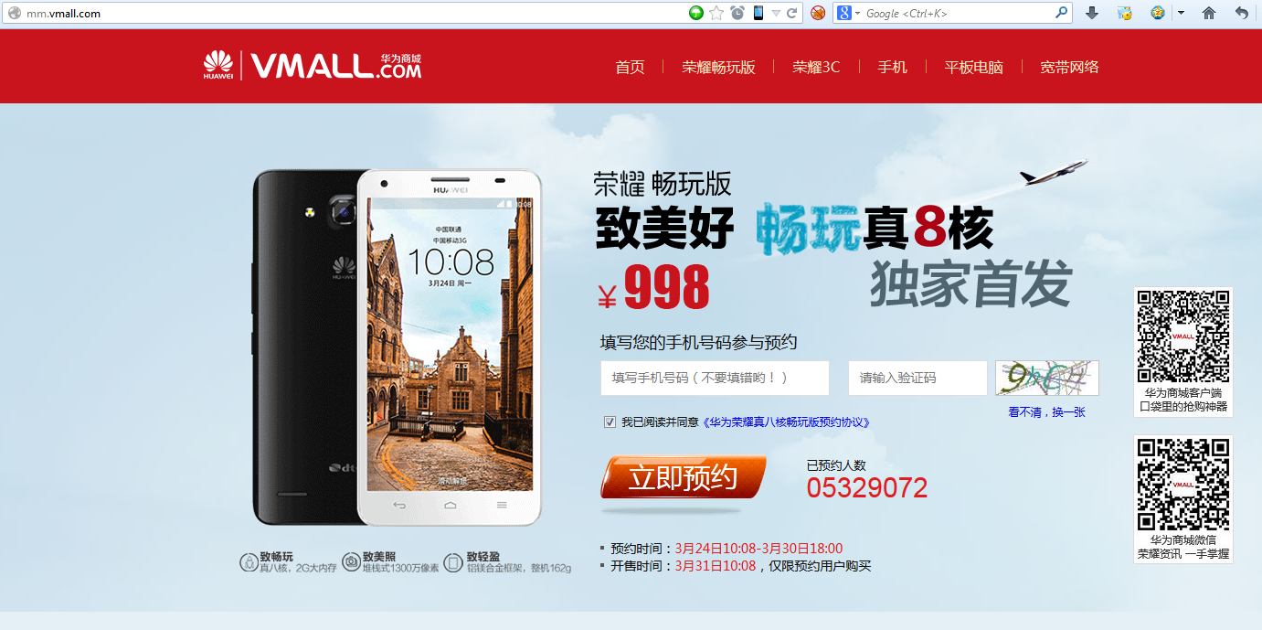 【背景】 之前看中了华为荣耀畅玩版: 【记录】抢购华为的荣耀3C和荣耀真8核畅玩版 所以要去预约,然后到时候再去抢购。 【折腾过程】 1.先是去预约: 登录华为主页,就可以看到: 华为 荣耀 畅玩版 http://mm.vmall.c...