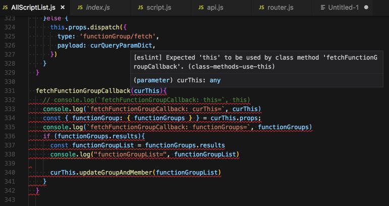 Antd Pro中Reactjs的代码出现警告: componentDidMount() { this.updateFunctionGroupsList(this.fetchFunctionGroupCallback) } ...