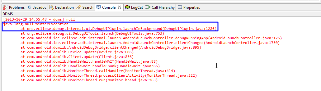 【问题】 android调试期间,无法打开模拟器了,出错: [2013-10-29 14:55:48 - ddms] null java.lang.NullPointerException at org.eclipse.debug.internal...