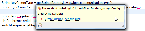 【问题】 android中,代码: String keyCommType = getString(R.string.key_switch_communication_type); 出错: The method getString(int) i...
