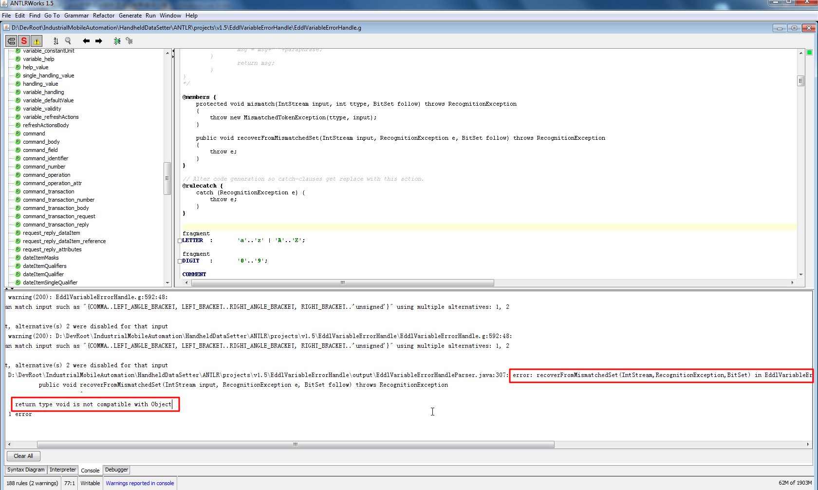 【已解决】antlr中尝试出错就退出,结果编译parser出错:error: recoverFromMismatchedSet(IntStream,RecognitionException,BitSet) in xxxParser cannot override recoverFromMismatchedSet(IntStream,RecognitionException,BitSet) in BaseRecognizer,return type void is not compatible with Object