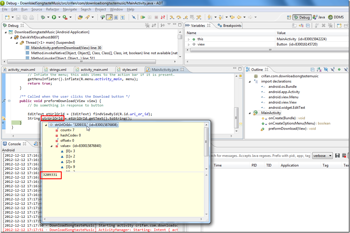 对于安卓版的DownloadSongtasteMusic,之前已经实现了,显示一个文本输入框和一个按钮: 【记录】实现安卓版的DownloadSongtasteMusic中的添加文本标签和文本输入框 现在接着去折腾,然后响应按钮点击,去执行对应的动作...