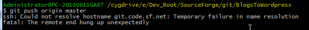 【问题】 折腾: 【记录】再次尝试用git上传BlogsToWordpress的代码到SourceForge中git仓库 期间,准备好git本地的代码后,去push,结果出错: Administrator@PC-20130611GART /cygdr...